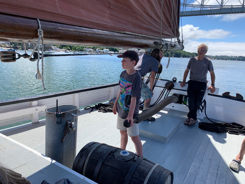 Helming Lynher under the watchful eye of skipper, Dom.