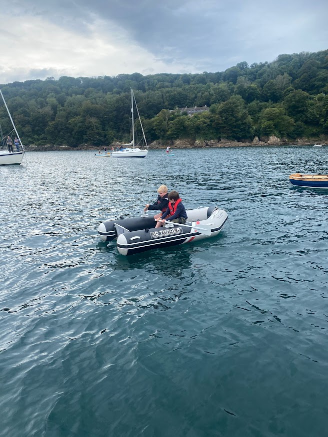 Testing their rowing skills, two of the younger dinghy sailors ferried food and passengers between the anchored boats at Cawsand.