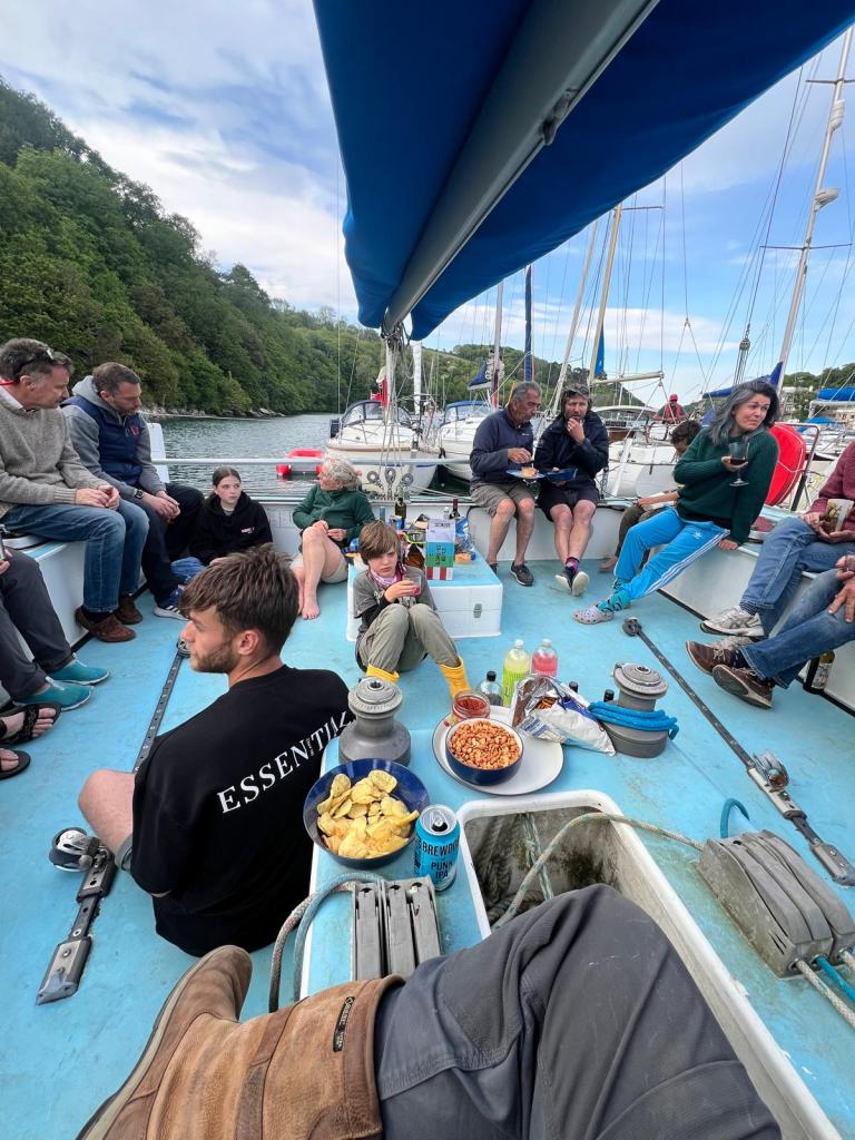 The event was organised by Alison Coombs, our Cruising Officer and had been intended to include separate groups being allocated to eat dinner aboard one of the four “host yachts”. However, seeing Julian Smith’s wonderful catamaran Lilly’s obvious potential, this was nominated as our “party boat” and the food was brought here for everyone to share together!
