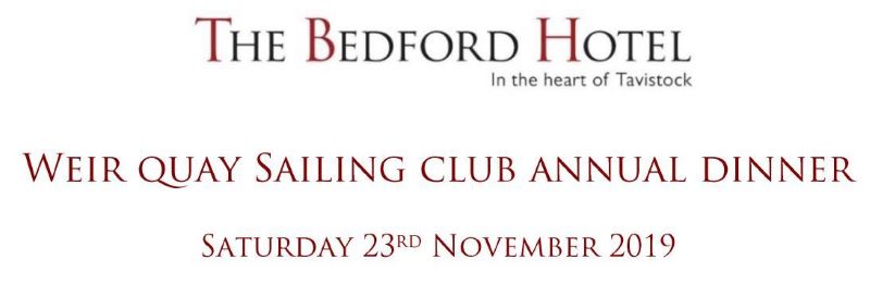 The Annual End Of Season Dinner of Weir Quay Sailing Club will be held at the Bedford Hotel, Tavistock on Saturday 23rd November 2019. We will gather for drinks in the bar at 7.00pm and sit down to dinner at 7.30pm. The dinner is open to members of WQSC and their guests and a formal