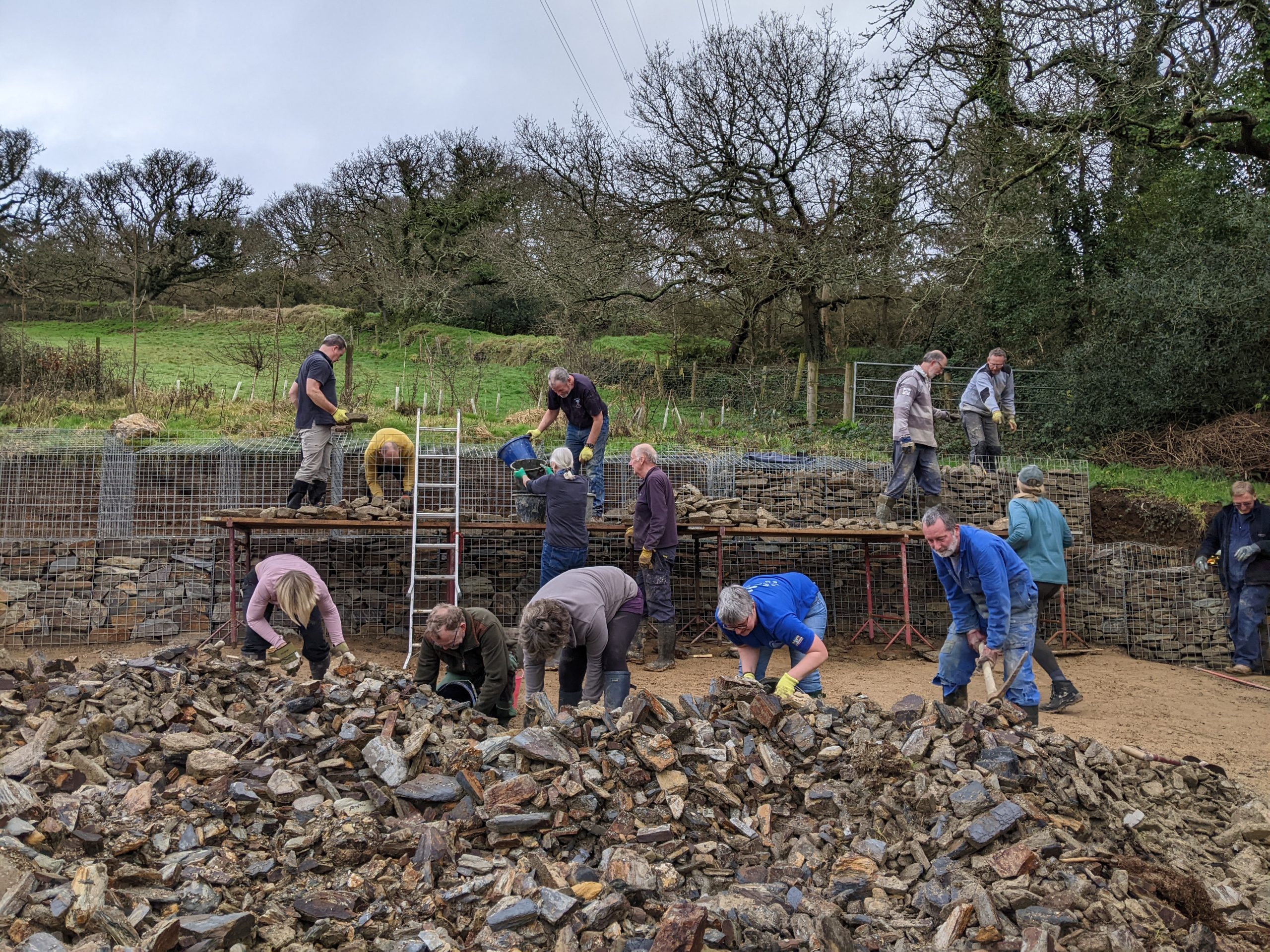A gang of Gabion Fillers, drawn from both the sailing club and the gig club, assembled again at the Hub Club today. Their task was to move rocks by hand from the huge stack, piled up in the parking area, across to the staging and into the upper gabion baskets. Heavy buckets of rock were